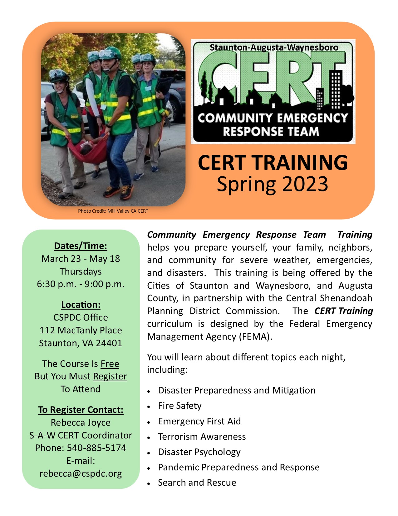 The current CERT course is the 40th time that the CSPDC has offered this training. Please contact Rebecca Joyce, Community Program Manager at rebecca@cspdc.org or 540-885-51174 ext. 112 if you would like to register for the training.